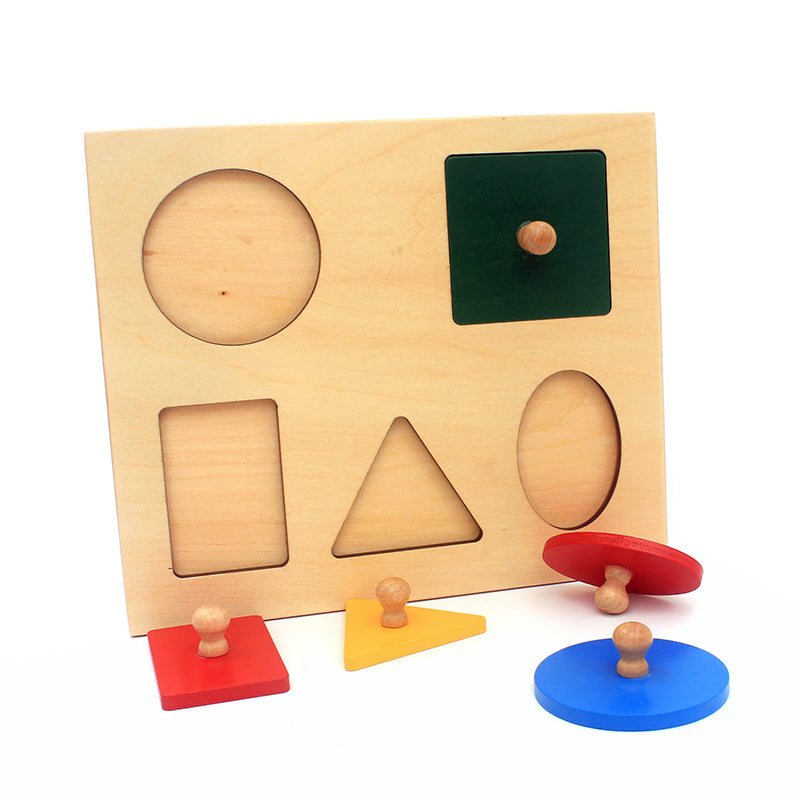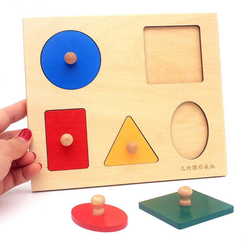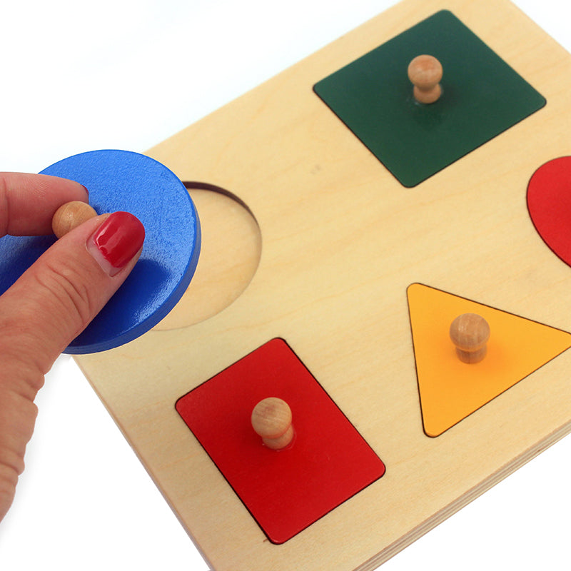 This wooden sensory puzzle is a great start into geometry learning for toddlers. It presents basic shapes of circle, square, rectangle, triangle and oval. Child can select shape, name it and fit into matching place on the wooden deck. .